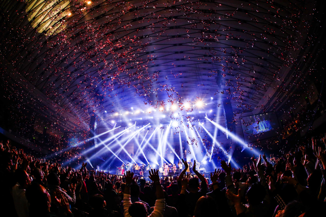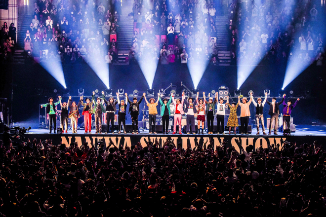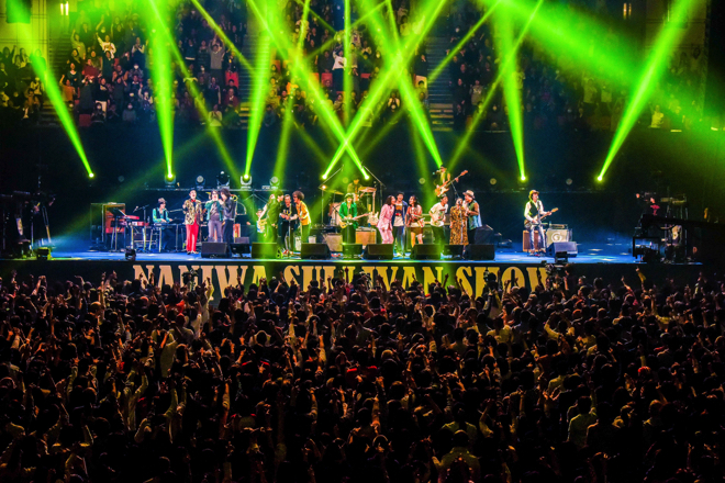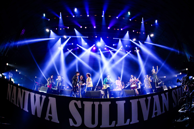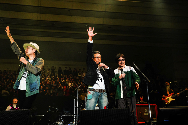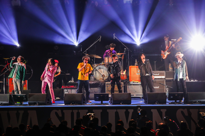 イベントのヒストリー映像がスクリーンに次々と映し出され、この日の演奏を一手に担う、NANIWA SULLIVAN ROCK’N’ROLL CLUB BANDとともに、奥田民生、トータス松本、渡辺大知が歌い上げた「ナニワ・サリバン・ショーのテーマ」から、会場中の観客がいきなり総立ちの幕開け。14年の時の流れなど微塵も感じさせない躍動感のあるサウンドに彩られたステージで、「ついに始まりましたよ<ナニワ・サリバン・ショー>、楽しんでください!」とはトータス。そのまま奥田が残り「つ・き・あ・い・た・い」を熱唱するなど、日本でも有数のロックミュージシャンたちが、忌野清志郎の名曲群を代わる代わる歌い継いでいく。