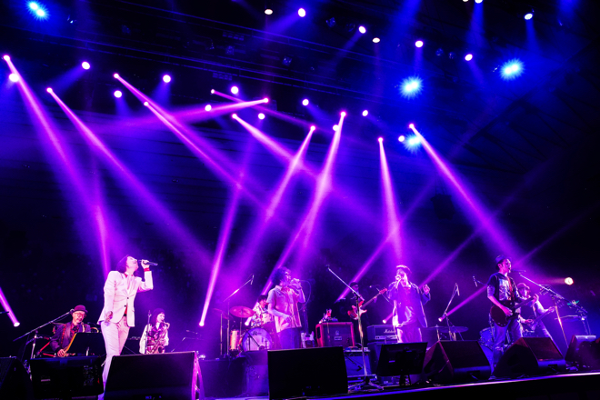 そして、「こんばんは、RCサクセションです!」と、仲井戸“CHABO”麗市がステージに現れると大きな歓声が上がり、ブルージーなギターを奏でつつ、時折、清志郎が憑依したかのように歌うチャボ。さらには、「3回目の<ナニワ・サリバン・ショー>で出会って、演出家だ何だの聞いてたけど、ギターを弾いてる姿を観て“あいつ、ロックンロールを知ってるぞ”って清志郎に言ったのを覚えてる」と、これ以上ない言葉で迎えられた宮藤を皮切りに、奥田、のん……と出演者がズラリ勢揃い。「清志郎、みんな集まってくれたぞ!」とあのギターリフが鳴り響かせ、「雨あがりの夜空に」、「激しい雨」を全員で歌う幸福なフィナーレには、音楽のピュアなエネルギーが充満していた。