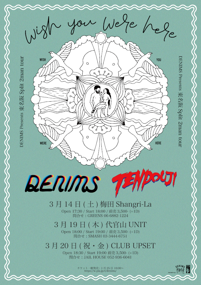 DENIMSが3月14日に梅田Shangri-La、3月19日に代官山UNIT、3月20日に名古屋UPSETでSplit 2man tour「wish you were here」を実施。そのゲストバンドが解禁され、東名阪共通でTENDOUJIが出演することが決定した。DENIMSとTENDOUJIの繋がりは深く、これまで対バンの機会も少なくなかったが、今回は東名阪を通してのスプリットツアーということもあり、ファンも待望のライブと言えるだろう。