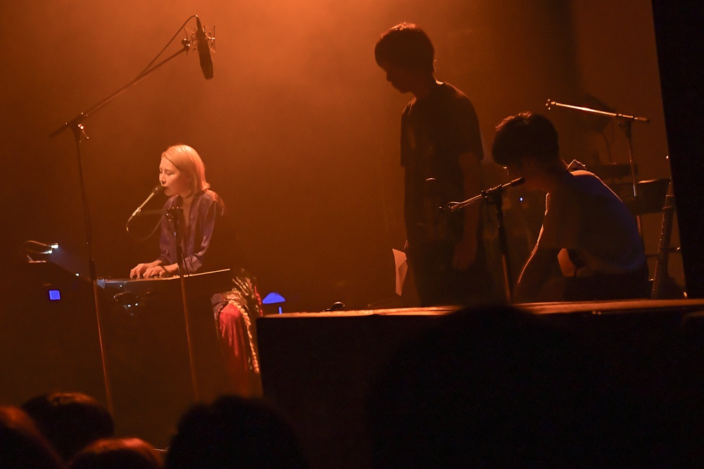 ステージ後方にあらわれたsébの文字。仄暗い会場に「Vega」の壮大なイントロが流れだすと、続いて世武裕子が颯爽と登場。最初はなめらかに、そして徐々に厚みのある声で歌い出したかと思えば、続く「Gardien」ではフランス語でささやきかけるように歌うなど、楽曲に合わせて表情を自在に操る世武裕子のボーカルが際立つ。