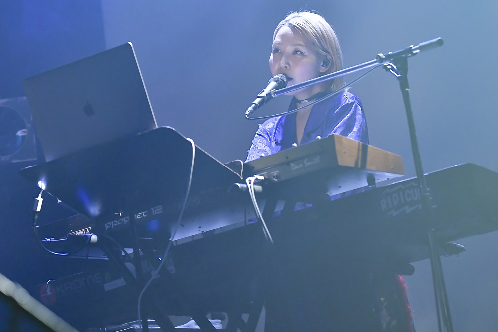間髪入れず、力強いピアノからの「Lost Highway」。激しいピアノはそのままに、よりビートが強くダンサブルになった「John Doe」Remix Ver.を披露。曲の終盤に向けてより速く、より低音が増していく演奏に息つく間もなく見入る観客。音にあわせ照明も加速しきったところで、光と音がふっと霧のように消えると、あふれる歓声。そして畳み掛けるように始まった「Do One Thing Everyday That Scares You」「Too Far」では、右に左に鍵盤の上を高速で指が行き交う演奏で圧倒させ、最後は全身のエネルギーを一音一音にこめるようなピアノで、ソロステージを終了させた。