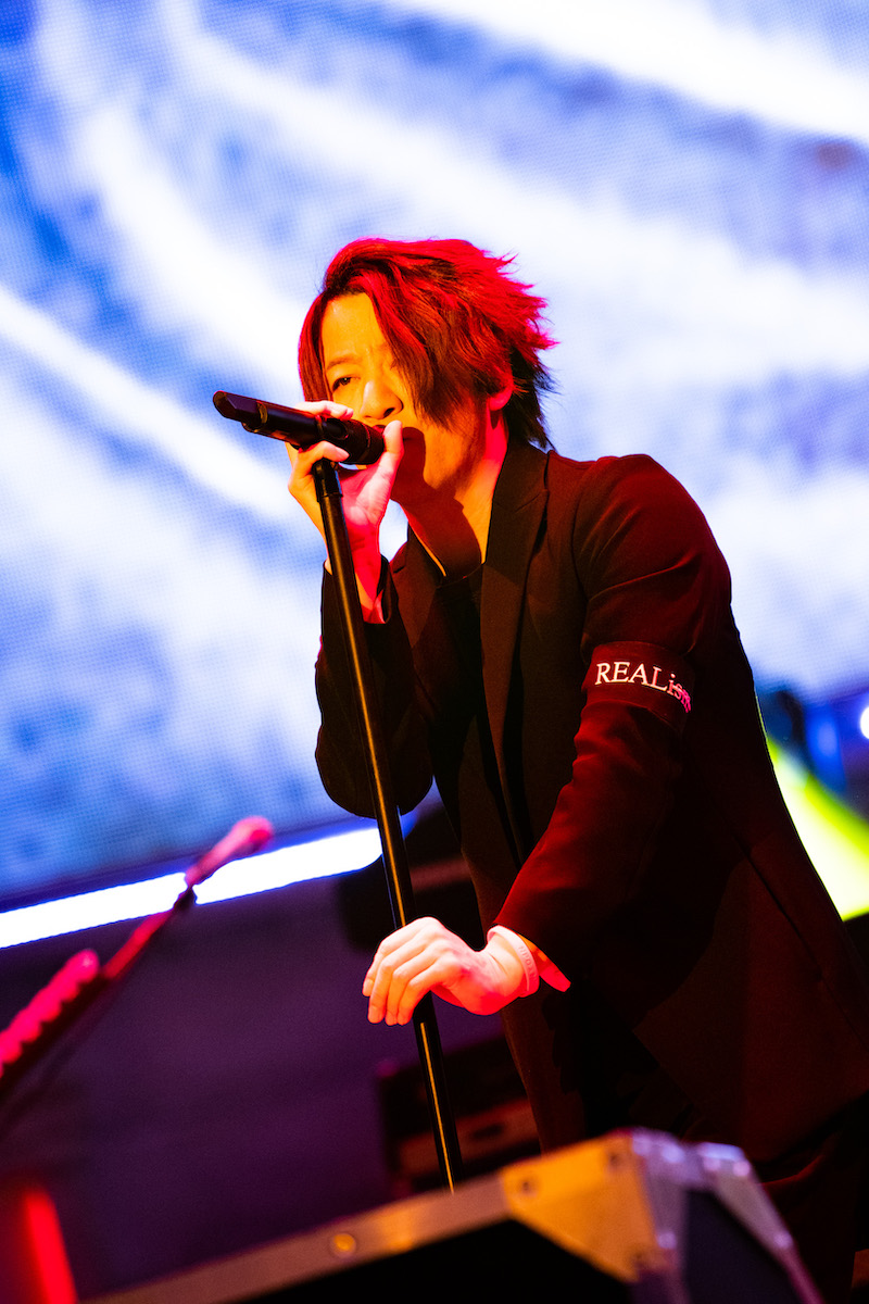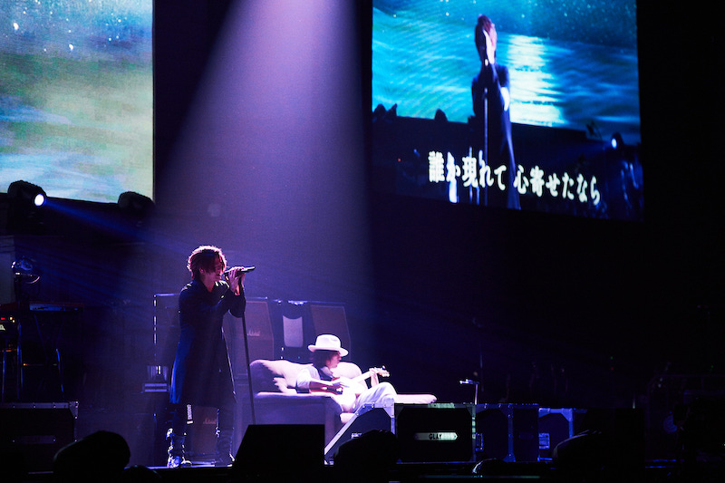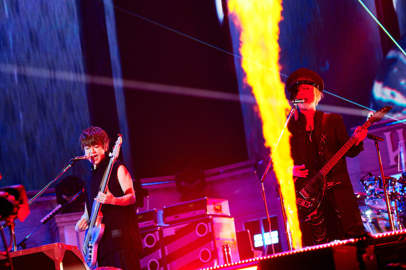 「BLACK MONEY」の主役はHISASHI&JIRO、まがまがしいロックンロールをワイルドなツインボーカルで会場を沸かす。ドラムのToshi Nagaiとのスリーピースは迫力満点だ。変わって「LET ME BE」の主役はTERU&TAKUROで、キーボードのハジメタルと共に奏でるアコースティックバラード。夢にしか生きられない男のロマンと悲哀を描く素晴らしい歌詞に、これ以上ないエモーショナルな絶唱で答えるTERU。個人的にこの日のエモ度No.1ソング、これが聴けて本当に良かった。