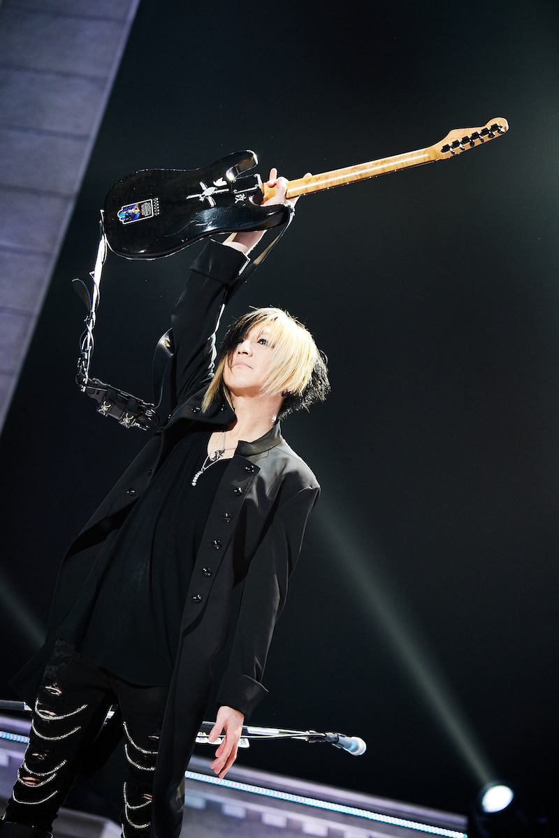 TAKUROが真面目なMCを始めた、と思いきや、「センキューみんな!」と、突然のハイテンションでしゃべりまくる。「なんで俺がここでしゃべってるかというと、Toshiのドラムが壊れたから」と、予期せぬ嬉しい(?)ハプニングを13000人が拍手と歓声で大プッシュ。「直った? 『VIRGIN BEAT』のイントロをくれ!」という無茶ぶりに、思わず叩いてしまうトシと、ついていこうとするHISASHI&JIRO。事情を知る人には、大笑いしながらもけっこうじーんと来るシーン。「小学校6年生からの付き合いですが、こんなにテンション高いTAKUROを見たのは初めて(笑)」とTERUも太鼓判を押すTAKUROのレアな名場面、この日会場にいた人はラッキーです。