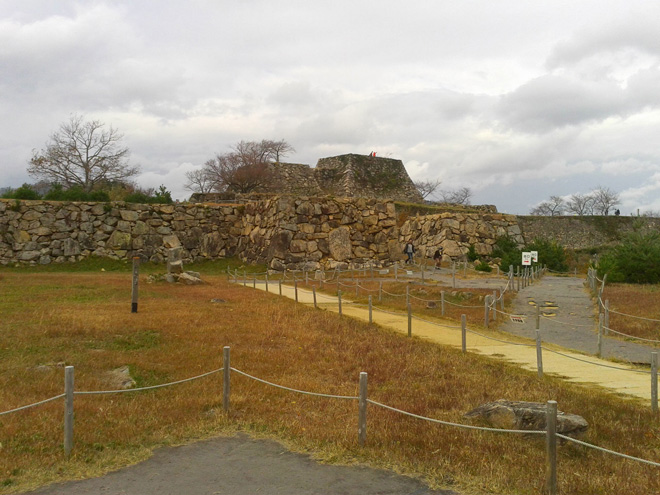 天守台を降りると順路は南二の丸へと進む。ここは家臣の住居だったようで、城内側の石垣が低く、導線に櫓台はあるが当時は全て屋根伝いの建物で埋め尽くされており、室内を移動するような状態だったらしい。ここの導線も道幅が狭くなり私の鍛え抜かれた腰と同じように見事なシェイプ!シェイプ!ブギーな胸騒ぎである。南二の丸に低い石段が二つ残っており、一つは本丸への導線、一つは住居の中への導線として使われていたことが伺える。