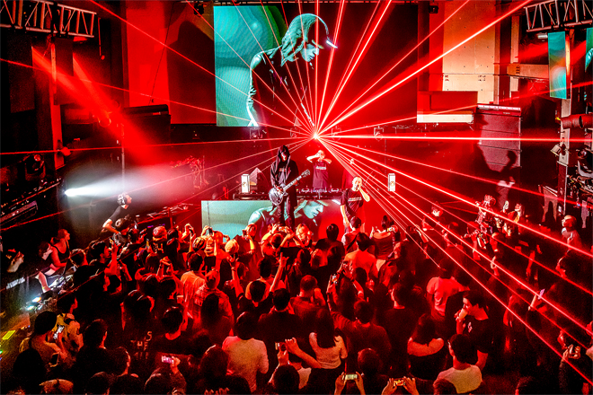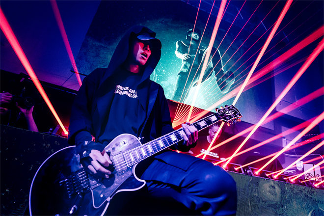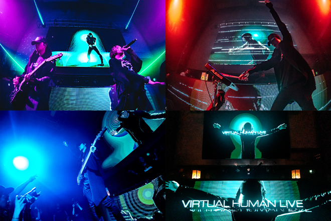 生身のYELLOCKによるDJ、ギター、ベース、ドラム演奏などその一挙手一投足を瞬時にトレースするバーチャルヒューマン。リアルとバーチャルがシンクロするそのハイブリッドなパフォーマンスには、会場に詰めかけた多くのオーディエンスが驚嘆、またモニター上のバーチャルヒューマンにはVJによるエフェクトも加味され、そのリアルでは実現不可能な映像も大きな喝采を浴びた。
