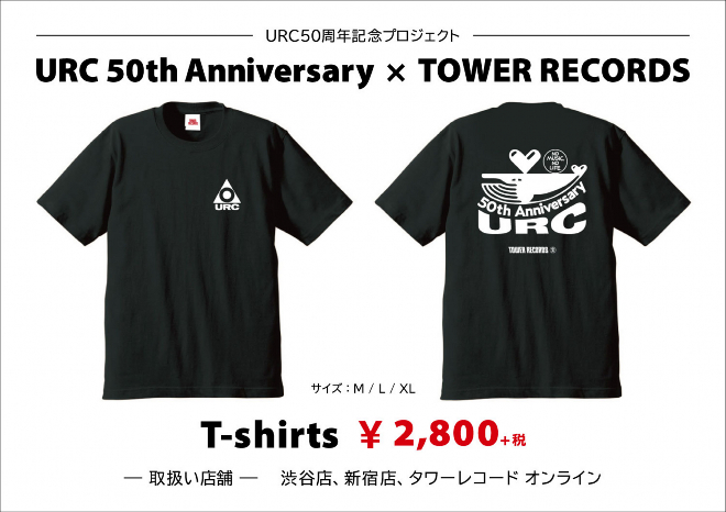 URC50周年記念プロジェクト21タイトル発売を記念して、TOWER RECORDSとのコラボアイテムが発売。フロントには往年のURCレコードロゴをプリント、バックには50周年記念のロゴとNO MUSIC, NO LIFE.のロゴをプリント。