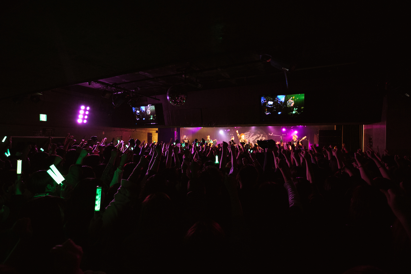 続くMCでは「今日、りょうくんは出ないよ?」と自虐をかましたり、初めてライブハウスに来た人を気遣ったり、お客さんに男性も女性も多いことを喜んだりと、ファンとの交歓を楽しむ。場内が理想的なテンションになってきたところで「せっかくワンマンでスペシャルなので、カバーを1曲やっちゃっていいですか?」と届けられたのは、なんと映画『NANA』の主題歌でおなじみ、中島美嘉の「GLAMOROUS SKY」だった。このサプライズには歌い出しから大歓声。としみつのボーカリストとしての力量も再確認できるナイスな選曲で、ポップなメロディーに満たされたフロアが興奮の坩堝と化す。