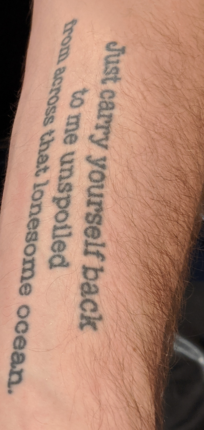 *と言いながらジェイソンはシャツを捲り腕のタトゥーを見せてくれた。そこにはディランの1964年アルバム『The Times They Are a-Changin’』の「Boots Of Spanish Leather」歌詞の一部が…。