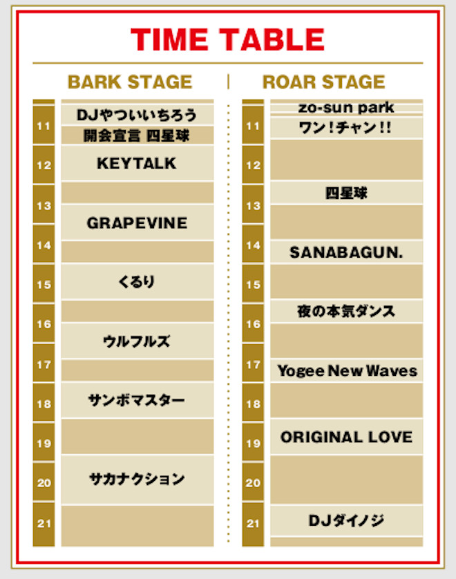 今回公開されたタイムテーブルでは、オープニングDJやついいちろう~KEYTALK~四星球と怒涛の“ロック祭り”でスタートを切る。そして、「ROAR STAGE」のトリをビクターロック祭り初出演となり、まさにロックレジェンドともいえるORIGINAL LOVEが、そして「BARK STAGE」のトリは2019年、待望のアルバム「834.194」をリリース、1月に映像作品を発売したばかりのサカナクションが務める。