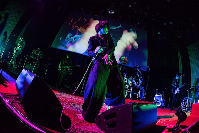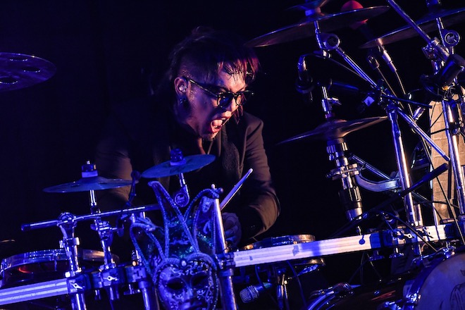 「不均衡キネマ」が盛大に炸裂すると、本編はいよいよ終盤へ。「犬型真性MASOCHIST」などのアグレッシヴで猥雑な楽曲の数々を繰り出し、「Midnight Shangrila」をきらびやかに轟かすと、5人はステージを後にした。