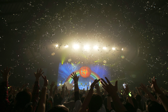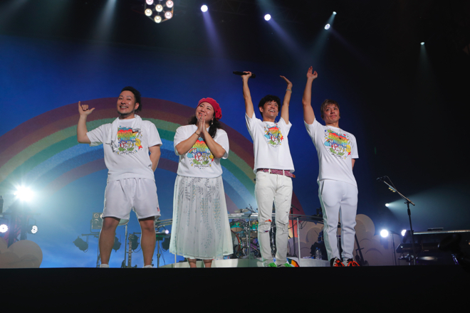 そして、再びHYのステージに戻ったところで「SESSION」「モノクロ」とライブナンバーが続き、沖縄への愛を歌った「Island」、そしてHYライブを象徴するアッパーチューン「隆福丸」、「ホワイトビーチ」で会場の全員とピース&ダンスを踊ると、虹に希望を込めた「no rain no rainbow」で、本編を終え大きく手を振りながらメンバーがステージを降りた。