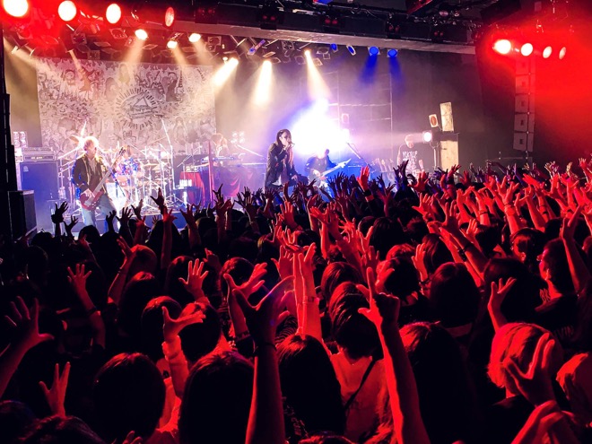 中盤は「悲観主義者が笑う」「死して塊」の重苦しいムードから一転、「1979」でアップライトベースに持ち替えたYUKKE(B)の跳ねるようにジャジーなリズムからスタート。ホーンセクションを含む新アレンジほか、各メンバーのソロパートも盛り込まれた展開に大歓声が上がった。続く「積想」「COBALT」は、まさしく最新型MUCCともいえるサウンドだ。鍵盤の旋律を大胆に織り交ぜ、メロディアスに仕上げられたこれら楽曲には楽曲構築力の高さが改めて浮き彫りとなる。