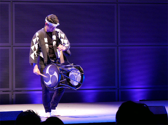 ▲ステージでは鼓童の北林玲央さんと渡辺ちひろさんがTAIKO-1を演奏。2つの打面とフチを巧みに叩き分け、多彩な音色を繰り出す。時には掛け声などのサウンドも交え、迫力のある太鼓の音を聴かせた。