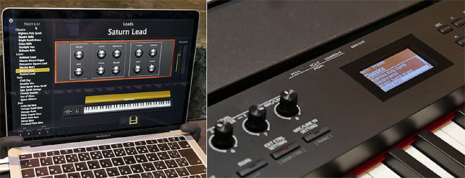 ▲Mac用のアプリMainStage(左)との連携機能では音色リストがRD-88本体のディスプレイに表示され、音色選択やノブの操作もRD-88で行える。