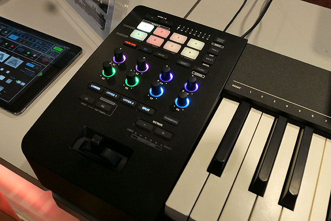 ▲鍵盤左側にマルチカラーの自照式のパッドとノブを各8つ搭載。一体型のピッチベンド/モジュレーション・レバーを備え、スプリットやレイヤーには個別のボタンを用意。