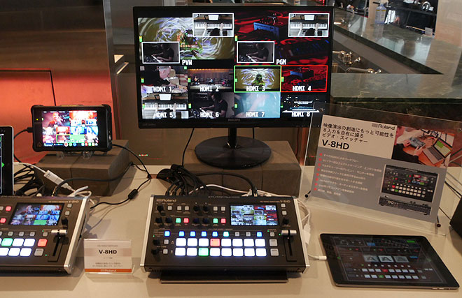 ▲本体画面で8つの入力映像と出力映像を同時にモニター可能。iPadアプリによる操作もデモ。