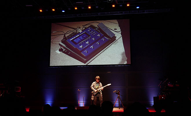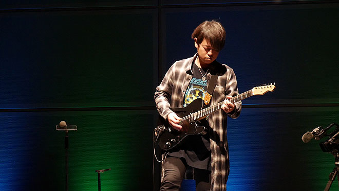 ▲弾き心地を問われた屋敷さん。「とても気持ちよく弾くことができますし、サウンドも作り込みができる仕様が特徴的」「ギターとしての表現方法をよりいっそう広げてくれる一台」とコメント。ドラム以外のサウンドをすべて「SY-1000」で作ったというトラックをバックに多彩なサウンドをプレイ。