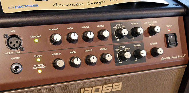 ▲ギターとマイクの2チャンネル仕様。ギター・チャンネルではPHASEスイッチとノッチ・フィルターを組み合わせることで、より効果的にハウリングを抑えることができる。