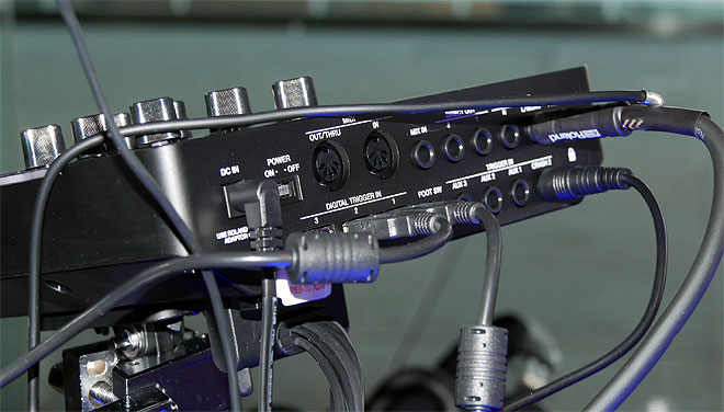▲背面にはマスター出力に加えダイレクト出力を2系統装備。スネアとバス・ドラムを別系統で出力し、PAで調整するなどステージ使用を考えた設計となっている。ボタンひとつで本体での録音も。