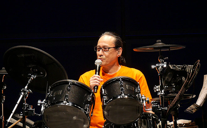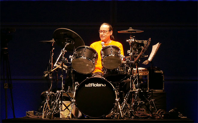 発表会のラストに登場したのはドラマーのそうる透さん。感想を聴かれ、「すべてが新しいですね、ほんとに。ヘッドから何から何まで新しいので。下(の展示エリア)で試奏できますよね? とにかく座っていただいて、このバスドラの踏み具合(と言いつつペダルをキック)、そしてデジタル・パッド、サイド・スティック(さらにパッドを叩く)、ぜひ体感していただきたいな、と思っております。」とコメント。そのアコースティック・ドラムらしいルックス同様、存在感のあるリアルなドラム・サウンドをパワフルにプレイして、イベント最後のステージを締めくくった。