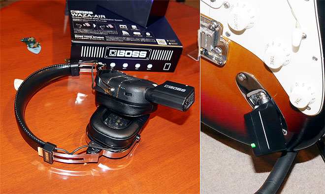 ▲トランスミッターをヘッドホン本体に接続するだけで最適な無線チャンネルなどの設定が完了(充電はヘッドホンとトランスミッターで個別に行う必要あり)。多彩なアンプ・モデルやエフェクトを内蔵し、詳細な設定はスマホ/タブレットの専用アプリでカンタンに行えるほか、プリセット切り替えや音量調節はヘッドホン本体で操作できる。アンプの音とBluetooth経由のスマホの音楽を個別に音量調整できるのも便利。写真右は付属のトランスミッターをギターに装着した状態。