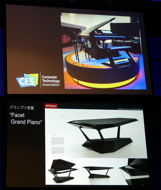 ▲CESに初出展された、未来のピアノを提案する新たなコンセプトモデル「GPX-F1 Facet」は映像で紹介。伝統的な音や形の制約を超え、理想のピアノのあり方をさぐるべく2015年に行われた「Roland Digital Piano Design Award」でグランプリに選ばれた作品「Facet Grand Piano」の具現化を目指し製作されたモデルだ。譜面台には大型Android対応ディスプレイを装備し、デジタル譜面の表示やオンラインのビデオレッスン、Amazon Alexaにも対応する。名称のFacetは複雑にカットされ美しく輝く宝石を意味する。先日行われたグラミー賞のステージでも使用されたことでも注目を集めたこのピアノ。コンセプトモデルのため発売予定はないが、楽器フェアなど国内でのお披露目に期待したい。