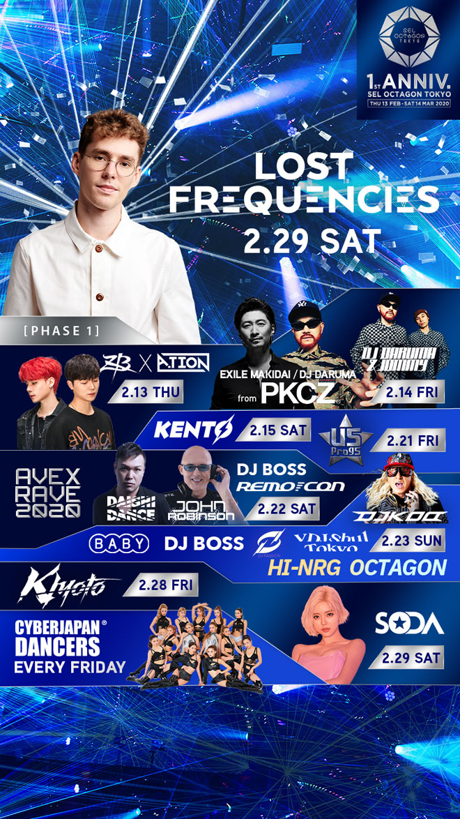 また、2月14日にはグローバルな活躍を魅せるクリエイティブチーム・PKCZ(R)からEXILE MAKIDAI、DJ DARUMAが登場。2月22日は90年〜00年代のダンスミュージック界の立役者であるJOHN ROBINSONを招聘し、「AVEX RAVE 2020」として往年のユーロビート/トランス/テクノをお届けする。2月23日は80’s DISCO SOUND「HI-NRG」をたっぷりお届けする「HI-NRG OCTAGON」を初開催。DJ KOOをゲストに迎え、HI-NRGの豪華DJ陣も出演する。