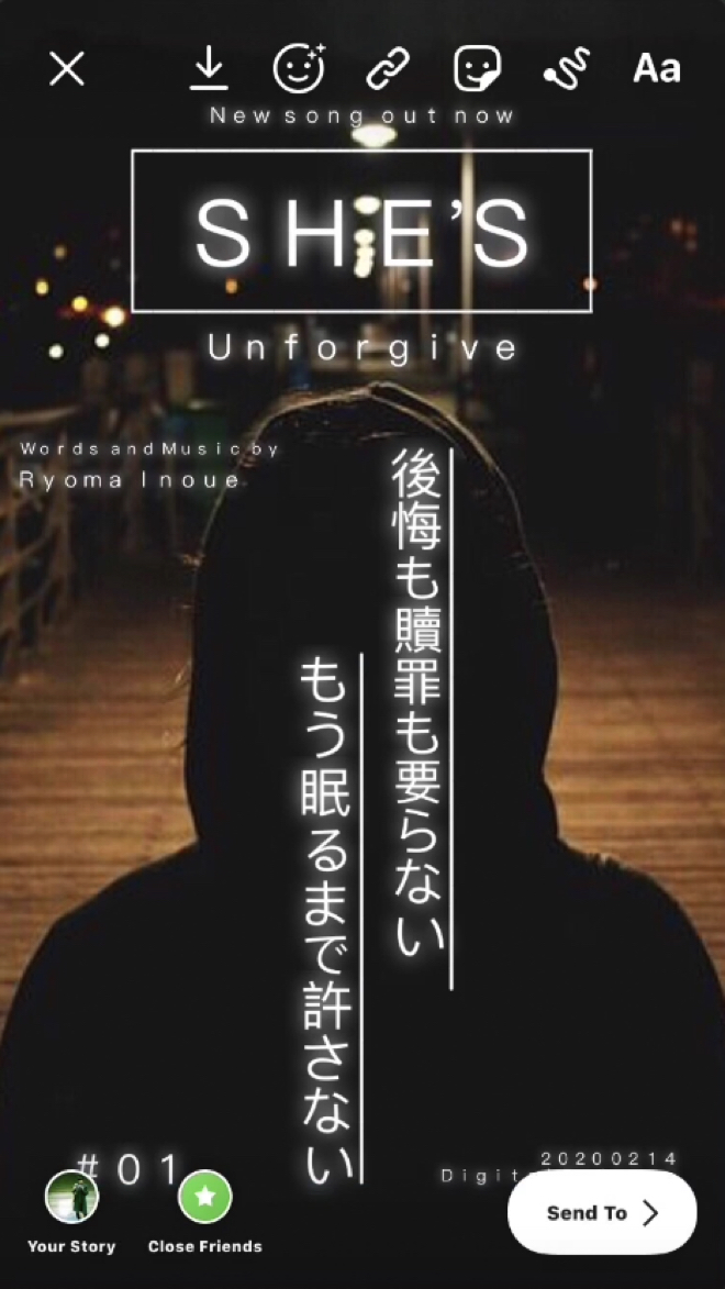 せとりょうは「SHE’SさんのUnforgiveのリリックビデオを作成させて頂きました。僕自身SHE’Sさんの曲はもともと聴いていたので、このような形で携わらせて頂き大変光栄に思います。またインスタストーリーズの新しい表現方法として、楽曲×ストーリーズの融合された作品を楽しんで頂ければ幸いです!」とコメントを寄せている。