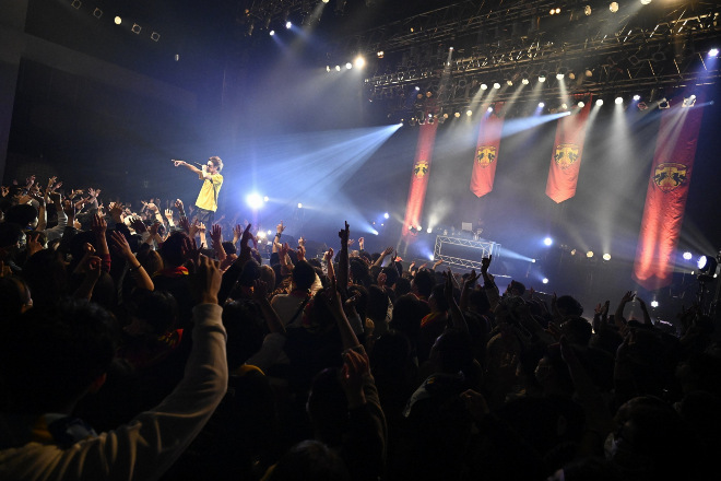 そして以前にTOCのバックDJを務め、2019年にはDJの世界大会で優勝を果たしたDJ松永(Creepy Nuts)と制作した「ミスターキャッチー feat. TOC / DJ 松永」や、「DISOBEY feat. TOC / 下拓」など、客演楽曲として制作され、『立国宣言』にも新たに収録された楽曲や、アカペラでの「入国ヲ禁ズ」、そしてハードダンスな「メシア」と、アルバム曲を矢継ぎ早に披露し、アルバムをライブとしても再構築していく。