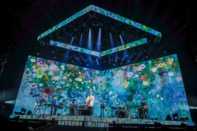 ステージセットは足元まで全面LEDが貼られており、上部には巨大な草花のモニュメントが鎮座。ステージ両サイドのスクリーンの縁にも草花が飾られていた。会場が暗転し、オープニングSEでその草花がフィーチャーされると、そのまま「インフェルノ」へ。「代々木ー!」とメンバーの掛け声に、客席からは割れんばかりの歓声が会場を包み込み、曲中、業火がステージを演出する。そして炎の赤とは対象的な「藍」ではブルーの照明、LEDでクールな世界観を演出する。