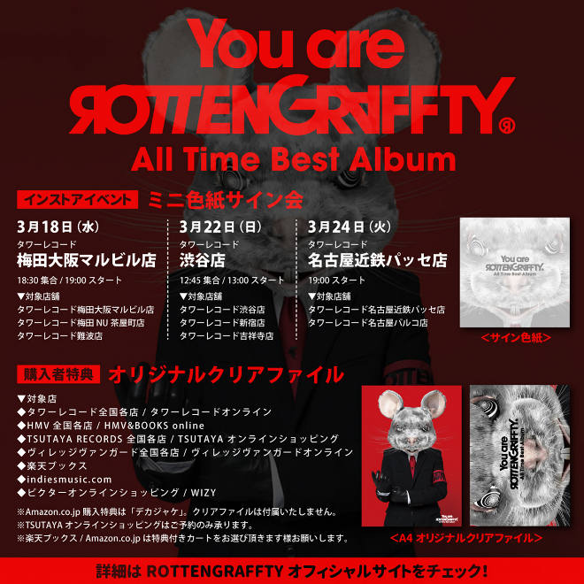 ROTTENGRAFFTYが、3月18日にリリースするオールタイムベストアルバム『You are ROTTENGRAFFTY』のインストアイベントを東名阪で開催する。