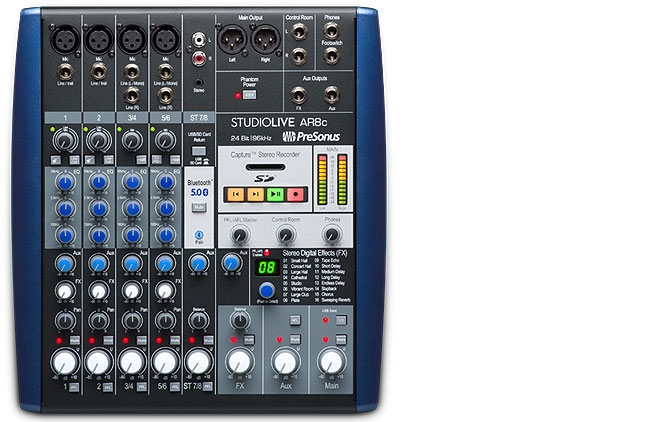 ▲StudioLive AR8cはモノ×2、ステレオ×2、RCA/ステレオミニ/USBまたはSDカード/Bluetoothの入力に対応するステレオSuper Channelの8ch仕様。各チャンネルのレベルはノブでの調整となる。