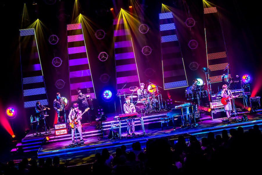 アルバムの中でもひときわエンターテインメント性の高い「旅は道連れ」では、楢﨑誠(B)がサックスに、小笹大輔(G)がパーカッションに持ち替えて演奏を始め、音源どおり4人全員で順番に歌い繋いでいく。メンバーがホーン隊とステージ上を練り歩きながらのパフォーマンスもあり、会場まるごとパーティのような盛り上がりだ。ふたたびギターを持った小笹のギターソロと楢崎楢﨑のサックスソロでハモってみたり、続く「ブラザーズ」では松浦匡希のドラムソロが挟まれたり、次々ステージで起こることから眼が離せない。メンバー全員が、それぞれの楽器が生み出す音を楽しんで奏で、今ここにしかない音楽が生まれていく。その一瞬一瞬を共有している多幸感に溢れていた。