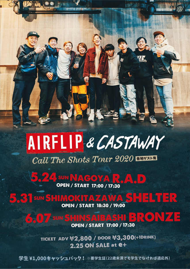 AIRFLIPとCASTAWAYが、5~6月にダブルヘッドライナーツアー<Call The Shots Tour 2020>を東名阪で開催する。