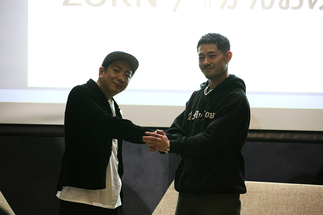 ZORNは「声がかかったのは昨日の夜、連絡をいただいて調整をして今日きました。これからも韻を愛でていきます。韻の固さは誰にも負けないです。聞いてみてもらえると嬉しいです」と緊張した表情に笑顔がこぼれる。