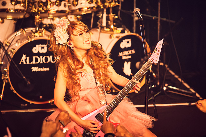 Marina:私も「Dearly」とか「Deep」は大好きで、ドラムを叩いていても楽しいんです。ドラムは打楽器だから、感情よりもリズムが重要なパートに思われがちですけど、自分の感情がダイレクトに出る楽器なんです。ドラムを叩きながらも歌っている感じがあって、Aldiousはそういう感覚で叩ける曲が多いんですよね。激しいといえど、その中にすごく歌心がある。Aldiousに入る前は、歌いながら叩いたことってなかったんですけど、Aldiousに入ってからは気がつくと歌っていることが多い。歌いながら叩いているときのほうが良いドラムになるみたいです。