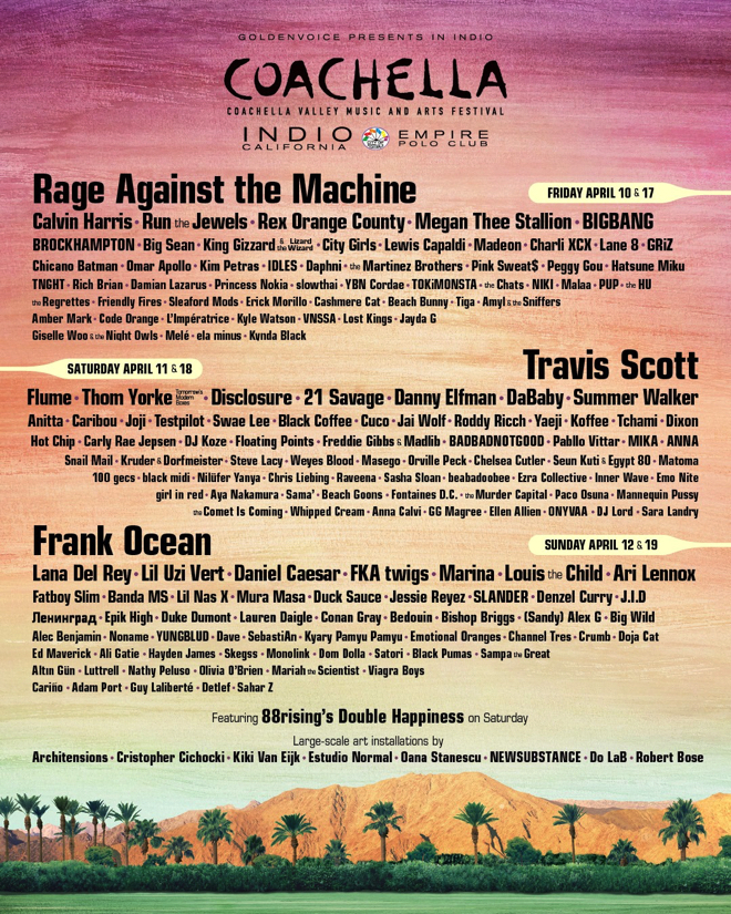 今年の<コーチェラ・フェスティバル>は、ヘッドライナーにレイジ・アゲインスト・ザ・マシーン、トラヴィス・スコット、フランク・オーシャンが予定されているが、そのほかのラインナップを含め変更される可能性もある。