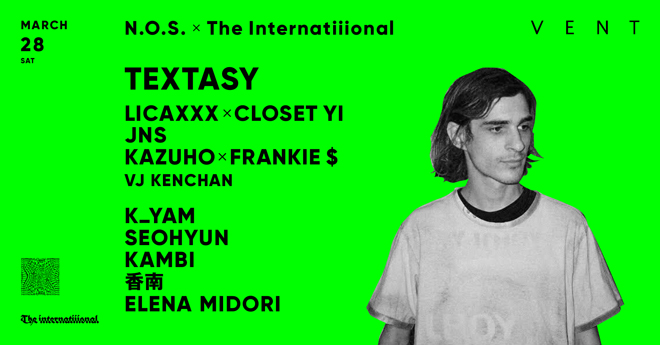 始動して2年を迎えるレイヴブラットフォームにしてレーベルとしても活動を続けるFrankie $、KAZUHO、k_yam、Kenchanの4人からなるN.O.S.(Nitrous Oxide Systems)。昨年にはデニス・スルタとD.ティファニーを迎えたVENTでのイベントも記憶に新しいところだ。積極的に海外のアーティストとコラボレーションを続けてきたN.O.S.とThe Internatiiional、そしてTextasyが創り出す最新型のレイヴをVENTのフロアで直に味わってほしい。