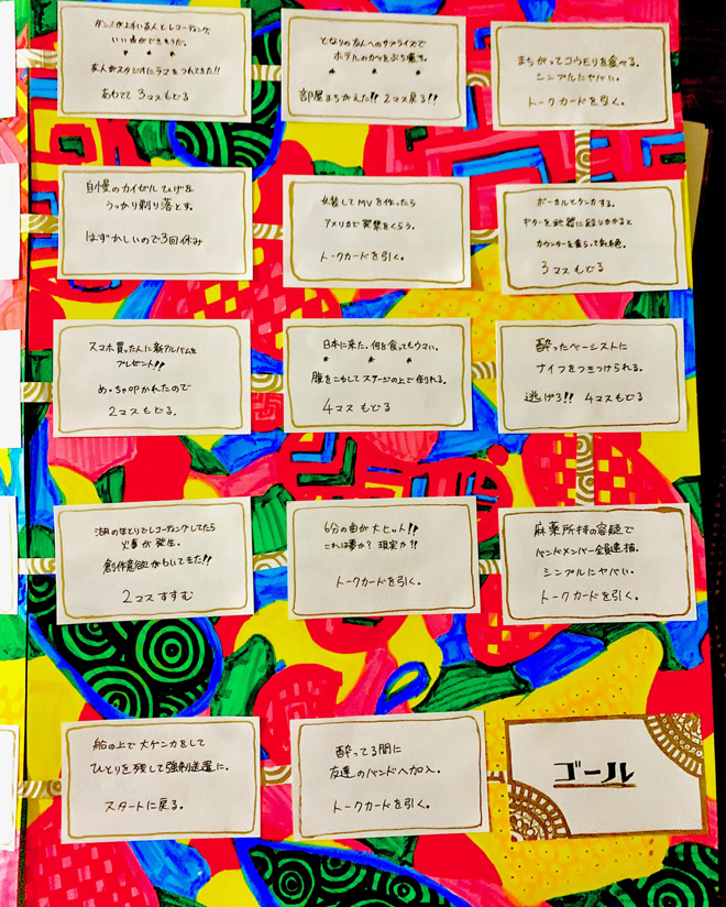 完成したすごろくは、ロックを知らない友達とふたりでテストプレイしました。マスは少ないのですが、「〇回休み」を抜いて、しゃべりながらワイワイやったら1時間くらいかかりました。シンプルに「〇マス戻る」が多い。作るのも遊ぶのも楽しいので、皆様もぜひ。