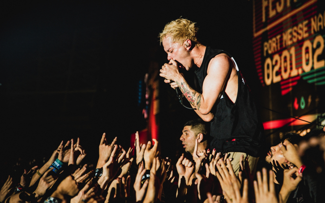 まず「FIRE STAGE」の一番手を務めたのはSurvive Said The Prophet。「T R A N S l a t e d」が始まると、朝っぱらから耳をつんざく爆音を響かせると、Yosh(Vo)のキャッチーな歌メロで観客の心を鷲掴みにする。ラウド、ポップ、エレクトロ、R&Bなど多彩なジャンルを横断するハイセンスな音楽性が魅力的な彼ら。しかしながら、泥臭い日本語詞でシンガロングを巻き起こす「Bridges」もライブで抜群に映えていた。「Pay money To my Painを連れ戻して、フェスをやってるcoldrain、頭上がらねえっす」とMCを挟み、「このシーンを大切にしましょう!」と熱く呼びかけ、トップバッターの役割をきっちりと果たす。