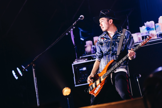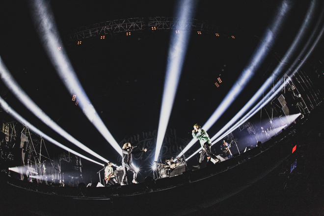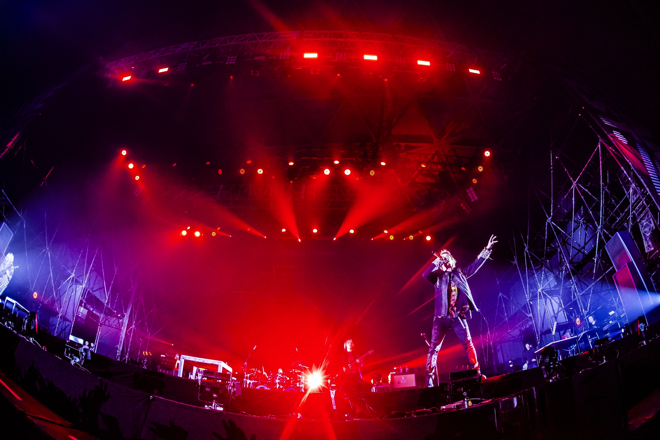 「Eye of the Storm」でじわじわと熱を伝えていくONE OK ROCKは貫禄漲るパフォーマンスで会場を掌握していく。「Taking Off」、「We are」と続け、アリーナロック仕様のサウンドにシビれるばかりだ。「苦楽を共にした仲間のフェス、精一杯のお祝いの気持ちで」と告げると、「Stand Out Fit In」へ。「Mighty Long Fall」を挟んだ後、壮大なスケールを描いたバラード風の「Wasted Nights」をプレイ。体の奥底から力が漲ってくるような懐の深いメロディに酔いしれてしまった。