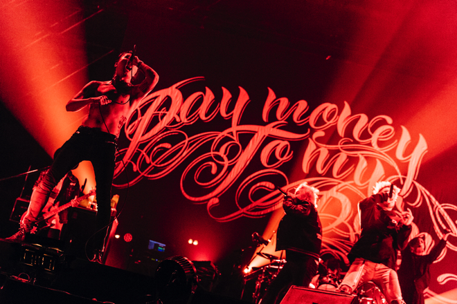 そして、2日目のトリ前を務めたのはPay money To my Painである。PTPコールが起きる中、スクリーンには当時のライブを含めた映像が流れ、PABLO(G)、T$UYO$HI(B)、ZAX(Dr)の3人が登場。荘厳な「gene」で幕を開け、「Resurrection」からMasato(Vo)、lynch.の葉月(Vo)による熱い掛け合いが繰り広げられ、「聴こえてるか、K!」と曲中に叫ぶMasato。「Weight of my pride」ではSiMのMAH(Vo)がヴォーカルを務め、「いつの間にかK君より歳を取っちまったよ!」と天に向かって言葉を投げかけていた。CrossfaithのKoie(Vo)、ROTTENGRAFFTYのN∀OKI(Vo)、NOBUYA(Vo)のトリプルヴォーカルで披露されたのは「Respect for the dead man」だ。「しんみりやるつもりはねぇ、HOUSE OF CHAOS(PTP主催のイベント)をよみがえらせる!」とKoieは吠え、野獣性剥き出しの攻撃力を発揮。途中、CrossfaithのTeru(Prog,Vision)も歌で参加していた。