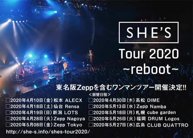 この生配信は、彼らが3月14日(土)、15日(日)に開催を予定していた<SHE’S Tour 2020 〜reboot〜>の大阪公演および高松公演が新型コロナウイルスの感染拡大の影響で延期となってしまったことを受けて実施されたものだ。2公演に続いて、本日3月22日(日)に予定されていた札幌公演、28日(土)に予定されていた福岡公演、29日(日)に予定されていた広島公演も延期となることが発表されているが、これに伴って“SHE’S Studio Session”のアーカイブ配信が実施されることとなった。