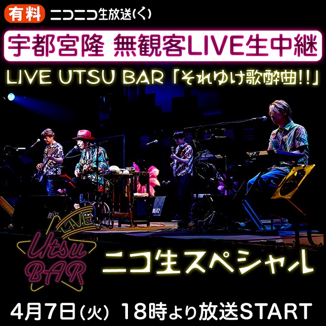 そこで、4月7日(火)の公演を急遽『LIVE UTSU BAR それゆけ歌酔曲!! ニコ生スペシャル』として配信する。なお、ライブの視聴にはネットチケットの購入が必要となる。