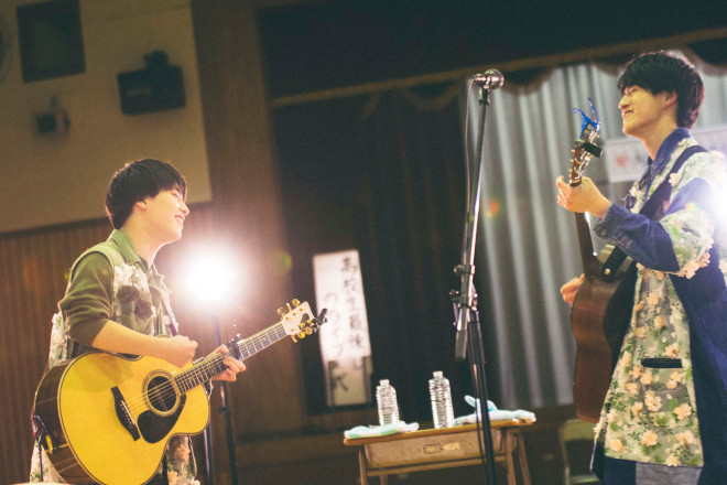 「しめじ体操」のMVが流れる間に、渋谷公会堂でお披露目するはずだった衣装に早着替えを済ませた二人は、体育館の中央に移動。尊敬するオーイシヨシマサさんからのお祝いメッセージや関係者からのメッセージに喜びつつ、昨年の夏ツアー中に自分たちで書き下ろした「青春の唄」で弾き語りライブをスタートさせた。雅功が<3月30日/君からのメッセージ/しめじの配信見ようよ/クラスのみんなで>と歌詞を変えて唄った「ふうせんはなび(卒業式ver.)」をはじめ、「だるまさんがころんだ」「かぜいろのめろでぃー」と中学卒業時も蘇るような思い出深い曲を披露した。