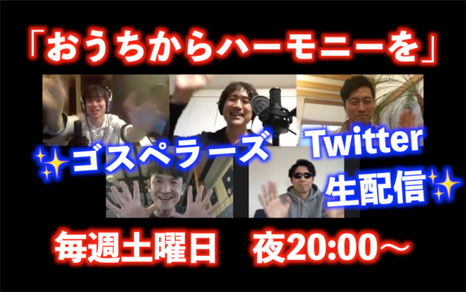 ゴスペラーズが、メンバーそれぞれが自宅から行う生配信「おうちからハーモニーを」をゴスペラーズの公式Twitterで行うことを発表した。