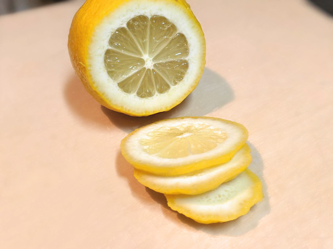 (1)左手にレモン、右手にペンを持ちたくなる気持ちを抑えて、レモンを厚さ3ミリ程度の輪切りに。“安らかなロクデナシの午後”に広がる爽やかな香り!