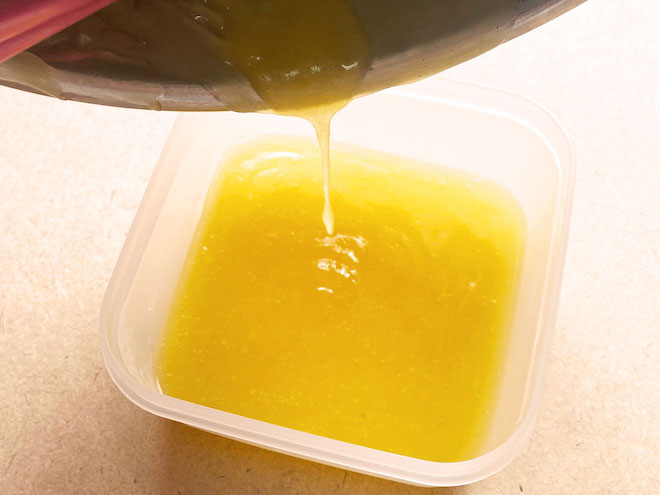 (2)卵、砂糖、無塩バター、(1)を混ぜて中火にかける。とろみがついたら火からおろし、粗熱をとる。“石の上slow”で、我慢して待つ。