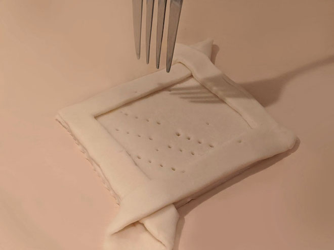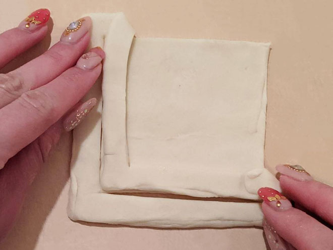(3)解凍しておいた冷凍パイシートを厚さ3ミリに伸ばし、半分にカットし正方形に。正方形の中に正方形を作る感じで切り込みを入れる。