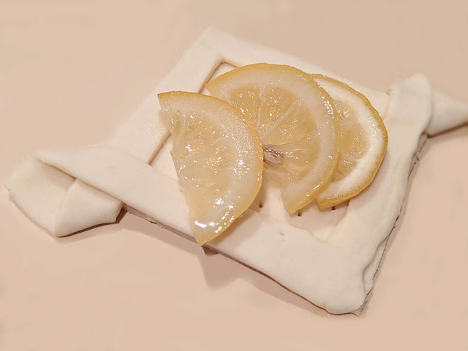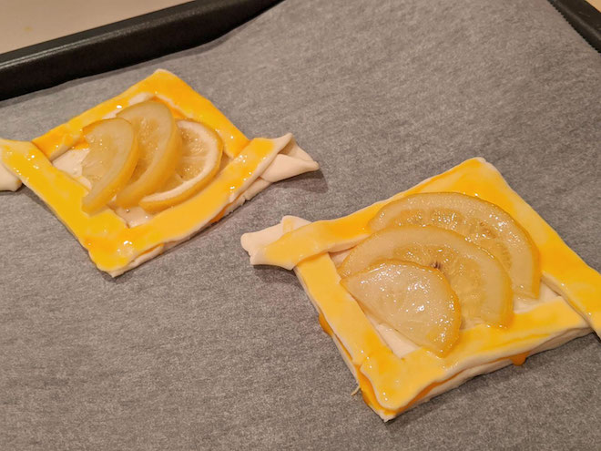(5)フォークで生地に穴を開け、(2)で作ったレモンを載せる。その間にオーブンを200℃に予熱。